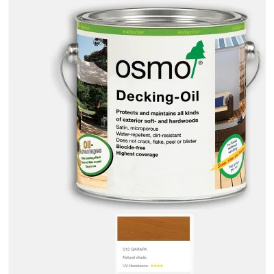 General description Osmo Decking Oil for Garapa wood is designed to enhance and protect wooden decking while maintaining the natural character of the wood. This oil is safe for humans, animals, and plants once dry, and it offers high resistance to water and dirt. Its microporous, penetrating finish prevents cracking, peeling, or flaking, and it does not require sanding when topping up the coating. Technical specifications Volume: 750ml Dry time: 12 hours Coverage: 24m²/L with one coat Recommended coats: 2 coats or one coat plus top coat of Osmo Anti-Slip Decking Oil 430 Moisture content max: 20% Surface preparation Bare wood species with high natural extractives need to weather for a minimum of 4 weeks before initial treatment or be cleaned with Osmo Brush Cleaner and Thinner. Resinous woods like Larch or Douglas Fir require at least 6 weeks of weathering. Pressure impregnated wood and tropical species such as Massaranduba, Bangkirai, Garapa, and Iroko need to weather for at least 3