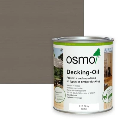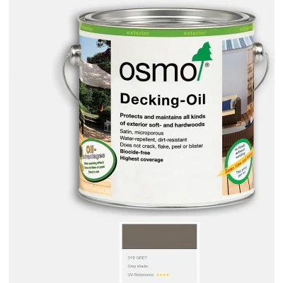 General description Osmo Decking Oil in Grey is designed to enhance the natural beauty of wooden decking while providing robust protection. This oil penetrates deeply into the wood, ensuring that the natural wood character remains visible. It is safe for humans, animals, and plants once dry, and offers high resistance to water and dirt, making it an ideal choice for outdoor applications. Technical specifications Volume: 750ml Coverage: 24m²/L with one coat Dry time: 12 hours Recommended coats: 2 coats or one coat plus top coat of Osmo Anti-Slip Decking Oil 430 Moisture content max: 20% Surface preparation Bare wood species with high natural extractives need to weather for a minimum of 4 weeks before initial treatment. Resinous woods like Larch or Douglas Fir require at least 6 weeks of weathering. Pressure impregnated wood and tropical species (e.g., Massaranduba, Bangkirai, Garapa, Iroko) need to weather for at least 3 months. Cedar also requires a 3-month weathering period. Greyed
