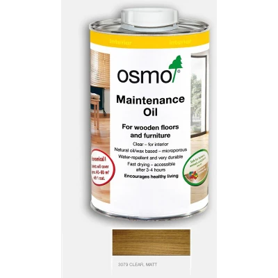 General description Osmo Maintenance Oil is a professional-grade product designed for refreshing and maintaining interior wooden flooring treated with Polyx-Oil. It is ideal for both domestic and commercial use, effectively cleaning and regenerating wood while removing tough stains such as grease and shoe polish. This fast-drying oil maintains protected surfaces without wear and allows for occasional maintenance without the need for sanding. Technical specifications Volume: 1 Litre Dry time: 3-4 hours Coverage: 40-60 m²/L with one coat Recommended coats: 2 coats Maximum moisture content of wood: 18% Compatibility and accessories Recommended application tools: Osmo Double Blade Scraper or Microfibre Roller and white pad (except for 3098) For smaller areas, a lint-free cloth can be used for application Installation Ensure the wood surface is clean, dry, and free of dust before application Clean the surface thoroughly with Osmo Intensive Cleaner and rinse with clear water Stir the oil