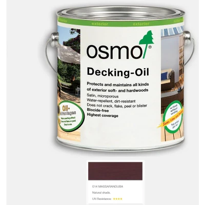 General description Osmo Decking Oil in Massaranduba is designed to enhance and protect wooden decking while maintaining the natural character of the wood. This oil is safe for humans, animals, and plants once dry, and it offers high resistance to water and dirt. Its microporous, penetrating finish prevents cracking, peeling, or flaking, making it an ideal choice for outdoor surfaces. Technical specifications Volume: 750ml Dry time: 12 hours Coverage: 24m²/L with one coat Recommended coats: 2 coats or one coat plus top coat of Osmo Anti-Slip Decking Oil 430 Moisture content max. for wood surface: 20% Surface preparation Bare wood species with high natural extractives need to weather for a minimum of 4 weeks before treatment. Resinous woods like Larch or Douglas Fir require at least 6 weeks of weathering. Pressure impregnated wood and tropical species such as Massaranduba need to weather for at least 3 months. Cedar also requires a 3-month weathering period. Greyed and weathered wood