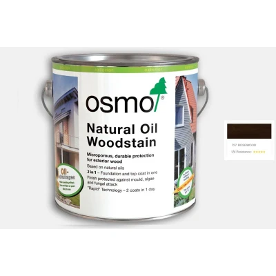 General description Osmo Natural Oil Woodstain in Rosewood is an innovative and durable wood protection solution that serves as both a base and top coat. This fast-drying product allows the natural wood grain to remain visible while providing exceptional resistance to weather, UV rays, water, dirt, algae, mould, mildew, and fungal attacks. Its microporous, breathable finish prevents cracking, peeling, or flaking, and no sanding is required for future applications. Technical specifications Volume: 125ml Coverage: 26m²/L with one coat Drying time: First coat: 4-6 hours; Second coat: 12 hours Moisture content of wood: max. 20% Compatibility and accessories Recommended application tools: Osmo Flat Brush or Microfibre Roller Care product: Osmo Spray Cleaner (Exterior) For additional protection, use Osmo WR Base Coat on all sides before application Installation Ensure wood surface is clean, dry, and frost-free before application. Stir well before use; do not thin. Apply the first coat to