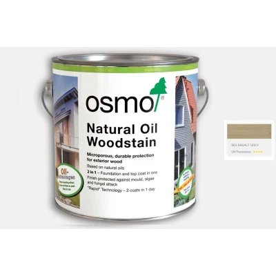 General description Osmo Natural Oil Woodstain in Basalt Grey is an innovative and durable wood protection solution that serves as both a base and top coat. This fast-drying product allows the natural wood grain to remain visible while providing exceptional resistance to weather, UV rays, water, dirt, algae, mould, mildew, and fungal attacks. Its microporous, breathable finish prevents cracking, peeling, or flaking, and no sanding is necessary for future applications. Technical specifications Volume: 125ml Coverage: 26m²/L with one coat Drying time: First coat: 4-6 hours; Second coat: 12 hours Moisture content of wood: max. 20% Compatibility and accessories Recommended application tools: Osmo Flat Brush or Microfibre Roller Care product: Osmo Spray Cleaner (Exterior) For additional protection, pre-treat with Osmo WR Base Coat Installation Ensure wood surface is clean, dry, and frost-free before application. Stir well before use and do not thin. Apply the first coat to all sides of the