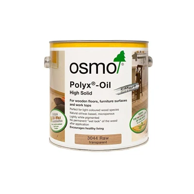 General description Osmo Polyx®-Oils are developed from natural oils and waxes to provide the most hardwearing and durable protection for wooden flooring and furniture. The Polyx®-Oil 3044 Raw is specifically designed to maintain the light, pale character of untreated wood by using a small amount of white pigments to neutralize the permanent 'wet-look' that can occur with clear finishes. This product is ideal for both untreated and sanded wood. Technical specifications Approx. coverage: 30m²/L with one coat Number of coats: 1 coat + 1 coat of Polyx®-Oil Original Application temperature: +5°C Drying time: 8-10 hours Usage Apply very thinly to achieve the desired results. Other information Advantages include: nearly invisible appearance, no 'permanent wet effect', light coloured wood stays light coloured, extremely durable and hardwearing, very water and dirt resistant, resistant to common liquid spillages such as water, juice, tea, cola, and wine, saliva-resistant and sweatproof