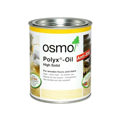 General description Osmo Polyx Oil Anti-Slip is a hardwax-oil developed from natural oils and waxes, providing durable protection for wooden flooring and furniture. This product features special additives that enhance slip resistance, achieving an R11 classification for added safety, making it suitable for both domestic and commercial use. Technical specifications Coverage: 24m²/L with one coat Number of coats recommended: 2 coats Application temperature: +5°C Drying time: 8-10 hours Available sizes: 0.125L, 0.750L, 2.5L Usage Extremely durable and hardwearing Water and dirt resistant Resistant to common liquid spillages such as water, juice, tea, cola, and wine Saliva-resistant and sweatproof, suitable for children's toys Microporous, breathable finish that does not crack, peel, or flake No sanding necessary for spot repairs or future applications Other information R9 slip rating is suitable for domestic and commercial applications where a safety floor is not required R11 slip rating