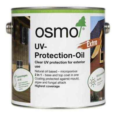 General description Osmo UV Protection Oil Tints is a lightly pigmented, satin, natural oil-based finish that provides a microporous coating, ensuring it does not crack, flake, peel, or blister. This product is designed to protect wood from external weathering, preventing the natural color from fading to a grey patina over time while adding a tinted color of your choice to enhance the wood's appearance. Technical specifications Coverage: 18m²/L with one coat Number of coats: 2 Application temperature: +5°C to 35°C Drying time: 12 hours Usage Osmo UV Protection Oil Tints is ideal for use on windows, doors, cladding, fencing, and other vertically structured joinery. It effectively blocks the greying process of wood with a UV protection factor of 12 compared to untreated wood.