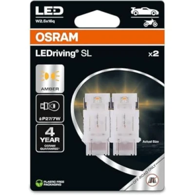 OSRAM LEDriving SL Off-road P27/7W: Ideal replacement for any vehicle Suitable for various vehicle exterior applications: Available in Amber Replaces conventional P27/7W lamps: Easy upgrade to LED technology with plug & play solutions Reliable OSRAM quality stands for less lamp replacements: 4-year OSRAM guarantee (refer to osram.com/am-guarantee for precise conditions) Suitable LED replacement for P27/7W Environmentally friendly, plastic-free packaging made from renewable materials and the usual OSRAM quality.