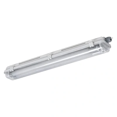 Lights.coFunctional SUBMARINE PCR damp-proof luminaire with two G13 T8 LED tube bulbs Dustproof and protected against water jets (IP65). Mercury-free and RoHS-compliant. M20 cable gland for 8-12 mm cables. Consists of at least 50% recycled plastic (in relation to the total weight of the plastic). Product advantages: Easy installation thanks to optimised space for mounting brackets and easy-to-open compartment. Highly efficient Energy Label D glass tube bulb to reduce the proportion of conventional environmentally harmful plastic. The bulb, made from recycled plastic, contributes to the reduction of CO2 emissions and plastic waste. Areas of application: Basements, garages, warehouses. For indoor lighting only. Technical features: Energy Label D LED tube bulb T8 is included with the product.