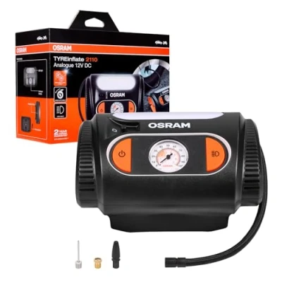 OSRAM TYREinflate 2110: Inflates a tyre from flat in 4 minutes (based on inflating a 13” tyre from flat to 2.41 BAR) Practical angled LED light that perfectly illuminates the area of work, so you can inflate with precision without needing to reposition the inflator 3m wind-up power cable with fused 12V DC plug and flexible 60cm air hose with easy access storage to effortlessly reach every corner of your vehicle and enjoy hassle-free storage with the neatly retractable cable, eliminating the frustration of tangled wires Screw stem connector, ergonomic design to assist ease of use and large easy-press power and light buttons Complete with three-piece adaptor kit to inflate bicycles, balls and other inflatables