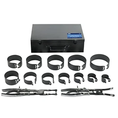 Piston ring installer Complete set includes 12 compressor sleeves Covering 1-3/8 inches through 4-3/8 inches diameter piston applications Both the ring compressor and ring expander pliers feature a ratcheting lock to hold the handles in position for easy piston and ring installation Complete with a metal carry case