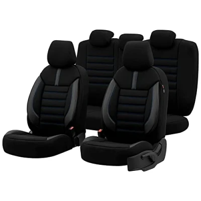 otoM Universal Fabric/Leather Seat cover set 'Limited' Black + Blue stitching 11 pieces compatible with Side Airbags