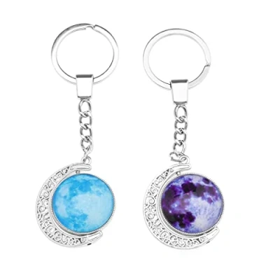 OTOTEC 2Pcs Moon Keychains Glass Key Rings Decorative Keyrings Round Colourful Accessories for Women Lady Girls Purple Blue