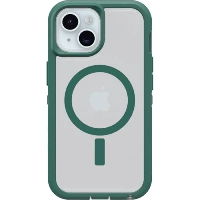 OtterBox iPhone 15, 14, and 13 Defender Series XT Clear Case VELVET EVERGREEN (Clear), screenless, rugged, snaps to MagSafe, lanyard attachment