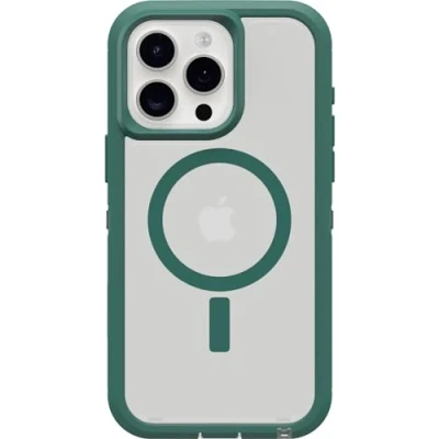 OtterBox iPhone 15 Pro MAX (Only) Defender Series XT Clear Case VELVET EVERGREEN (Clear), screenless, rugged, snaps to MagSafe, lanyard attachment
