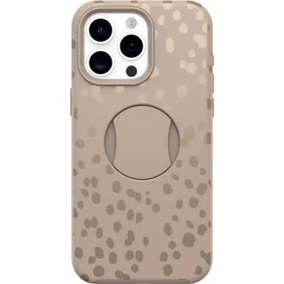 OtterBox iPhone 15 Pro MAX (Only) OtterGrip Symmetry Series Case ON THE SPOT (Brown), built in grip, sleek case, snaps to MagSafe, raised edges protect camera & screen