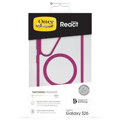 OtterBox React Series Case with Magnets for Samsung Galaxy S26, Shockproof, Drop proof, Ultra Slim, Protective Thin Case, Tested to Military Standard, Clear/Pink