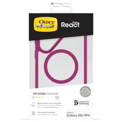 The React Series case with Magnets for Samsung Galaxy S26 Ultra undergoes thousands of hours of drop testing to ensure your smartphone gets the utmost protection. Protect your smartphone with ultra-slim React Series Case, the Samsung Galaxy S26 Ultra case that's easy to install and has as many drops as military standard (MIL-STD-810G 516.6). The React Series case guarantees wireless Fast Charge thanks to built-in magnets perfectly aligned to make wireless charging faster and easier than ever before. Seamlessly attach and remove accessories through built-in magnets. OtterBox React Series Case contains a minimum of 40% recycled content, consisting of 100% recycled plastics, and provides flawless, sleek and stylish protection from scratches and cracks. This ultra-slim, pocket-friendly case has raised screen bumpers to help protect the touchscreen.