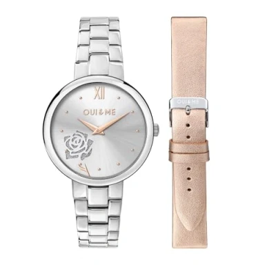[Materials] Oui&Me CHÉRIE Women's watch, made of recycle steel, with steel bracelet and pin buckle [Functions] Analogue watch with quartz movement and time only, 2h [Features] The watch case measures 34 (case diameter) and is 7,80mm thick. The white silver dial features 2 HANDS INDEXES and a SAPPHIRE CRYSTAL [Water resistance] The watch is water resistant up to 5 ATM [Packaging] Oui&Me Official presentation box and 2-years warranty