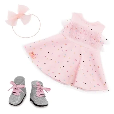 18-inch Doll Pink Dress Outfit: Fashion fans can party in playful style with the Our Generation Pink & Colorful outfit for 18-inch dolls! Child-Friendly Fashion: Includes a confetti-print dress, a large bow headband, and boots with real laces to tie. Mix & Match: Clothing has easy-open closures to quickly put on and remove as kids explore imagination and self-expression. Compatible with most 18-inch dolls, doll clothes, and accessories. Recommended Age: This Our Generation doll clothing set makes a great gift for kids ages 3+ (small parts), encouraging them to create their own unique stories. Doll Clothing Set Only: Our Generation dolls sold separately., Manufacturer: Maison Battat Inc.