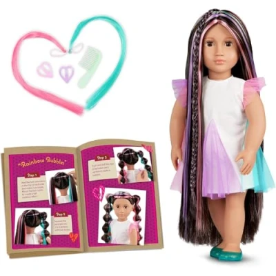18-inch Hair Grow Doll: Braid, play, and style the day away with Our Generation doll Tina! Detailed Features: Tina has lifelike dark-brown eyes that open and close with long (really long!) rainbow hair that's fun to style and accessorize. Extendable Braid: Kids can make Tina's braid longer or shorter with the push of a button for added styling fun! Easy to Play: She has a huggable soft body with a movable head, arms, and legs to easily change her outfit during dress-up. Includes: 18-inch doll, cute dress with rainbow tulle, a pair of undies, casual shoes, a comb, 2 colorful hair extensions, 2 heart-shaped hair clips, and a step-by-step hair style guide to create 4 beautiful looks., Manufacturer: Maison Battat Inc.