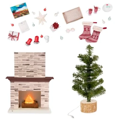 28-piece Holiday Set: spread festive cheer through your 18-inch doll’s home with the Our Generation Holiday Celebration Set! Fun Lights & Sound: fireplace lights up and makes a realistic fire sound for extra holiday glow, and the tree lights up to set the perfect scene! Includes: fireplace, tree, string of lights, star tree topper, 9 ornaments, 2 presents, 2 stockings, painting, 2 candles, letter to Santa, plate, 2 snowflake cookies, glass of milk, tray, and 2 cups of apple cider. Mix & Match: compatible with most 18-inch dolls and accessories. Recommended Age: suggested for kids ages 3+ (small parts)., Manufacturer: Branford Ltd.