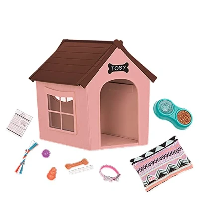 Dog House Playset: give your pup a home sweet home with the Our Generation Puppy House set for 18-inch dolls and 6-inch pups! Fun Features: rooftop opens to store the accessories, and the real chalkboard and chalk let you write your puppy's name! Includes: dog house, collar, pillow, food bowl, toy rope, ball, treat toy, bone, newspaper, and chalk. Dimensions: measures approximately 8.75" (L) x 10.38" (W) x 10.13" (H); fully assembled. Mix & Match: compatible with most 18-inch dolls and accessories., Manufacturer: Battat