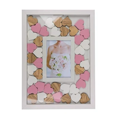 Photo frame holds one 4" x 6" photo of the bride and groom. Around this photo there are 42 wooden hearts for your guests to write a personal message. These can be inserted through the slot at the top of the frame (similar to a money box). So you can present a wedding photo in your home, surrounded by the messages of the people you accompanied on your big day. The frame comes with 42 wooden hearts in three different colours that will hold messages or congratulations. Dimensions: 38 x 28 x 1.5 cm. Weight: 935 g. Colours: white, wood and pink. Material: high strength plastic and PVC