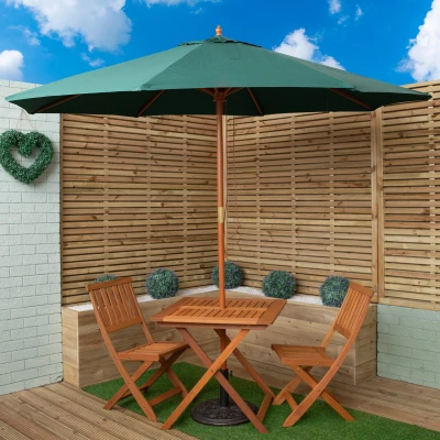 Elevate your outdoor living with this 2 person outdoor square wooden table and chairs with green parasol and base set. Whether you're sipping your morning coffee, enjoying drinks, or unwinding in the fresh air, this set offers both functionality and elegance with its durable construction, comfortable seating and timeless design, it's the perfect addition to any outdoor space to enjoy the beauty of nature while relaxing in style.. The set includes a wooden, square folding table with 2 wooden, folding chairs, a green parasol and parasol base. An outdoor wooden patio table and chairs set brings a unique blend of elegance, comfort and practicality to your outdoor space. The texture and colour of the wood can blend seamlessly with natural surroundings that enhances your outdoor experience. Finished with teak oil, the design of the table features a cross leg frame and a slatted table top with a parasol hole and the chairs are a simplistic yet contemporary style with a modern slatted wood. When not in use the set can be easily folded down and stored away.. With a parasol and base included you can shield yourself from the sun, The umbrella parasol is designed to provide ample coverage allowing you to stay cool, comfortable and protected in your outdoor space. This garden parasol offers a sleek and modern design with a green canopy and wooden pole that will add a touch of sophistication to any outdoor setting. Use the pulley mechanism to open and close the umbrella and pull the string to elevate the beams and secure the key in place within the pre-drilled hole. The cast iron parasol base has been made with strong resin materials that make a great addition to any garden decor. Choose the correct spacers and adjust the tightening knob for a secure fit for the parasol.. Supplied flat packed and self assembly is required.. Product Dimensions. Table: Height: 74cm Length: 75cm Width: 75cm Parasol Hole Diameter: 5cm Table Top Thickness: 2cm Cross Leg Length: 89cm Leg Thickness: 3cm. Chair: Height: 87cm Length: 46cm Width: 38cm Seat Height: 44cm Seat Depth: 34cm Backrest Height: 39cm Folded Dimensions: Height: 104cm Length: 45cm Depth: 12cm. Parasol Height: 2.4m Diameter: 2.7m Pole Diameter: 38mm. Parasol Base: Height: 35cm Diameter 45cm Weight: 9kg
