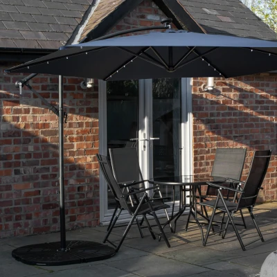 Relax and enjoy your leisure time this summer with this attractive glass top outdoor dining table and 4 chairs set with blue banana lit parasol and base weights. This stunning set will become the focal point to your garden, terrace or patio area making it ideal for dining on or just enjoying drinks in the summer sun and has space for up to 4 seats. Having an outdoor patio furniture set can greatly enhance your outdoor living space and creates a comfortable and inviting space for you to relax, entertain, and enjoy nature.. The set includes a black, round tempered glass top table with 4 multi-position chairs, blue banana parasol and parasol base weights. Having a black steel set will blend seamlessly with its surroundings. It adds sophistication and a sleek, modern touch to your patio or garden. The frame of the table and chairs are made from steel and have been finished with a powder coating for added strength and durability. The chairs have a textilene backing and they can easily be folded away when not in use for easy and convenient storage. Choose from various positions to recline by adjusting the seat handles to sit back and unwind.. Enjoy stylish shade day and night with this elegant blue banana parasol, complete with base weights for added stability. Featuring a generous 3m canopy, it provides ample coverage to keep you cool, comfortable, and protected from the sun in your outdoor space. Designed with both function and sophistication in mind, this garden parasol boasts a sleek, modern look that adds a refined touch to any patio or garden setting. As the sun sets, the parasol comes to life with 24 white LED lights integrated into the canopy ribs, creating a warm and inviting ambience for evening gatherings. The crank handle ensures smooth opening and closing, while each base weight can be filled with sand or water for secure positioning during use.. The set is supplied flat packed and self assembly is required.. Product Dimensions. Table top Diameter 90cm Table top thickness: 4cm Table Height 70cm Leg thickness 3cm Parasol hole Diameter 5cm. Chair Dimensions Seat Height 43cm Seat Width 44cm Seat Depth 41cm Backrest Height 65cm Armrest Length 43cm Total Height 107cm Total Width 56cm. Max user weight 110kg. Parasol Dimensions: Height: 2.4m Canopy Diameter: 3m. Parasol Base Dimensions: Height from ground 7.5cm Length: 50cm Width: 50cm Base weight Approx 50kg water filled / 80kg sand filled