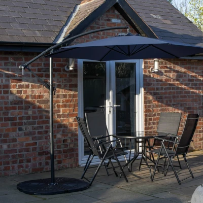 Relax and enjoy your leisure time this summer with this attractive glass top outdoor dining table and 4 chairs set with blue banana parasol and base weights. This stunning set will become the focal point to your garden, terrace or patio area making it ideal for dining on or just enjoying drinks in the summer sun and has space for up to 4 seats. Having an outdoor patio furniture set can greatly enhance your outdoor living space and creates a comfortable and inviting space for you to relax, entertain, and enjoy nature.. The set includes a black, round tempered glass top table with 4 multi-position chairs, blue banana parasol and parasol base weights. Having a black steel set will blend seamlessly with its surroundings. It adds sophistication and a sleek, modern touch to your patio or garden. The frame of the table and chairs are made from steel and have been finished with a powder coating for added strength and durability. The chairs have a textilene backing and they can easily be folded away when not in use for easy and convenient storage. Choose from various positions to recline by adjusting the seat handles to sit back and unwind.. With a blue banana parasol and base weights included, you can shield yourself from the sun. With a 3m canopy, this parasol is designed to provide ample coverage allowing you to stay cool, comfortable and protected in your outdoor space. This garden parasol offers a sleek and modern design with it's blue canopy which will add that touch of sophistication to any outdoor setting. Wind the crank handle to open and close the umbrella for a smooth and easy to use experience. Simply, fill each base weight with sand or water to keep your parasol in place whilst in use. Secure the weights with the included metal clips.. The set is supplied flat packed and self assembly is required.. Product Dimensions. Table dimensions: Table top Diameter 90cm Table top thickness: 4cm Table Height 70cm Leg thickness 3cm Parasol hole Diameter 5cm. Chair Dimensions Seat Height 43cm Seat Width 44cm Seat Depth 41cm Backrest Height 65cm Armrest Length 43cm Total Height 107cm Total Width 56cm. Max user weight 110kg. Parasol Dimensions: Height: 2.4m Canopy Diameter: 3m. Parasol Base Dimensions: Height from ground 7.5cm Length: 50cm Width: 50cm Base weight Approx 50kg water filled / 80kg sand filled