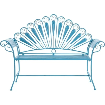 Outdoor Bench with Peacock Feathers Pattern. Bring a touch of elegance to your outdoor area with this beautifully designed garden bench. The peacock feather detailing on the backrest and the distressed effect add a unique, artistic flair, while the iron construction ensures long-lasting durability. It's also finished with an e-coating which is an electrochemical process that applies a uniform, protective layer across the entire metal surface. Ideal for both cosy gardens and larger patios, this bench combines style and practicality for your outdoor retreat. Details: Product Type: Bench General Color: Blue Material Type: Metal Main Material: Iron Finish: Powder Coated Seats Up To: 2 People Dimensions: Armrests Height: 70 cm Depth: 50 cm Seat Height: 46 cm Width: 146 cm Height: 107 cm Seating Surface: 109x42 cm Weight: 11 kg Weight Capacity per Person: 120 kg Offer Includes: 1 x Bench Key Features: Firm and Comfortable Seating, Classic Design, Adds Warmth to Outdoor Space, Precise