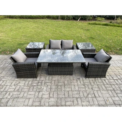 Outdoor Garden Dining Sets 4 Seater Rattan Patio Furniture Sofa Set with Rising Lifting Table 2 Side Tables Dark Grey Mixed Fimous