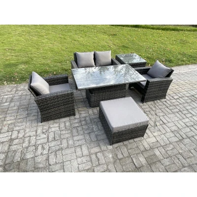 Outdoor Garden Dining Sets 5 Seater Rattan Patio Furniture Sofa Set with Rising Lifting Table Big Footstool Side Dark Grey Mixed Fimous