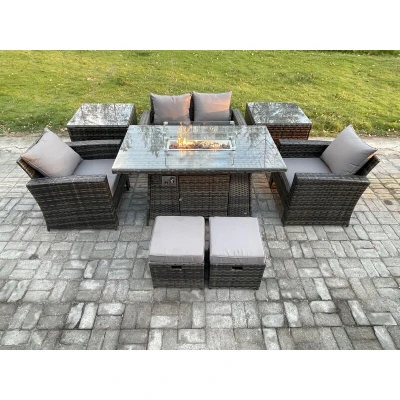 Outdoor Garden Dining Sets 6 Seater Rattan Patio Furniture Sofa Set with Gas Firepit Table 2 Small Footstools Side Tables Dark Grey Mixed Fimous