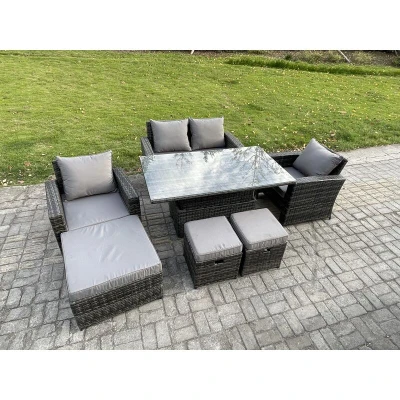 Outdoor Garden Dining Sets 7 Seater Rattan Patio Furniture Sofa Set with Rising Lifting Table 3 Footstools Dark Grey Mixed Fimous