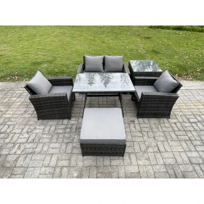 Outdoor Garden Furniture High Back Rattan Sofa Dining Table Set with Big Footstool Side Dark Grey Mixed Fimous