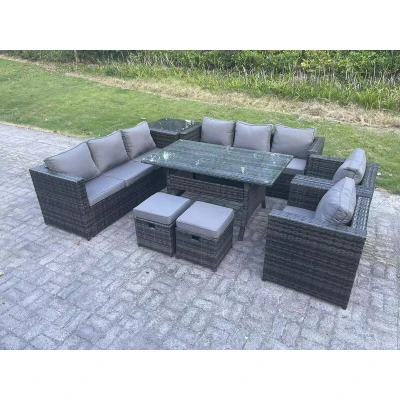 Outdoor Garden Furniture Rattan Lounge Sofa Set Patio Rectangular Dining Table with 2 Armchair Side Small Footstool 10 Seater Dark Grey Mixed