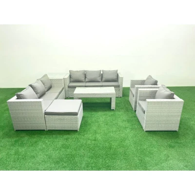 Outdoor Garden Furniture Rattan Sofa Set with 2 Armchairs Oblong Coffee Table Big Footstool Side Light Grey Mixed Fimous