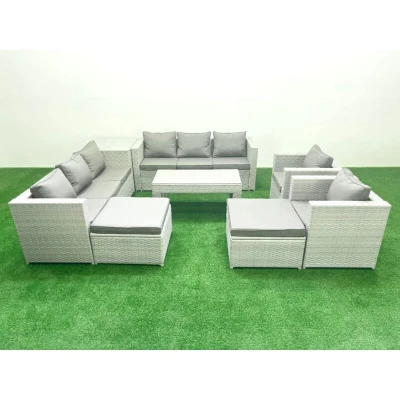 Outdoor Garden Furniture Rattan Sofa Set with 2 Armchairs Oblong Coffee Table Big Footstools Side Light Grey Mixed Fimous