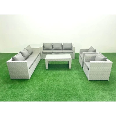 Outdoor Garden Furniture Rattan Sofa Set with 2 Armchairs Oblong Coffee Table Side Light Grey Mixed Fimous