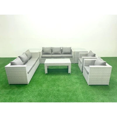 Outdoor Garden Furniture Rattan Sofa Set with 2 Armchairs Oblong Coffee Table Side Tables Light Grey Mixed Fimous