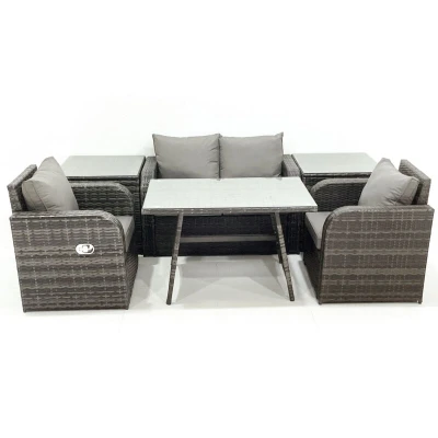General description This classic outdoor garden furniture set is designed to accommodate up to 4 people, featuring a comfortable and soft cushion back. Made from premium dark grey rattan, it is built to withstand British weather conditions. Technical specifications Set Dimensions: 2 x Side coffee table: 65L x 65W x 66H cm 2 x Reclining Chair: 74W x 67D x 79H cm 1 x Love Sofa: 124W x 67D x 79H cm 1 x Rectangular Dining Table: 110L x 70W x 70H cm Seat Cushion Thickness: 8 cm Installation Items come flat packed and are easy to assemble. Sturdy galvanized steel tube metal frames with powder coating to prevent rust. Usage The reclining chairs are adjustable, allowing you to change the back inclination from 90° to 130°. Keep the cushions indoors or use a rain cover when not in use. Use a rain cover for the furniture if not in use for an extended period. Other information 5mm thickness transparent tempered glass with suckers on the surface to prevent sliding. Removable cushion covers for