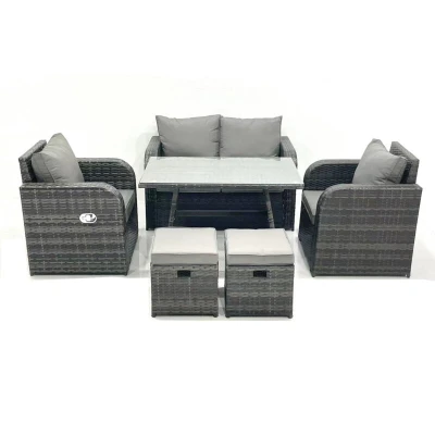 General description This classic outdoor garden furniture set is designed to accommodate up to 6 people, featuring a comfortable and soft cushion back. Made from premium dark grey rattan, it is built to withstand British weather conditions. Technical specifications Set Dimensions: 2 x Fully Assembled small footstools: 40L x 40W x 34H cm 2 x Reclining Chairs: 74W x 67D x 79H cm 1 x Love Sofa: 124W x 67D x 79H cm 1 x Rectangular Dining Table: 110L x 70W x 70H cm Seat Cushion Thickness: 8 cm Installation Items come flat packed and are easy to assemble. Sturdy galvanized steel tube metal frames with powder coating to prevent rust. Usage The reclining chairs are adjustable, allowing you to change the backrest inclination from 90° to 130°. Keep the cushions indoors or use a rain cover when not in use. Use a rain cover to protect the furniture if not used for an extended period. Other information 5mm thickness transparent tempered glass with suckers on the surface to prevent sliding.