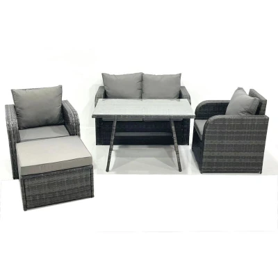 General description This classic outdoor garden furniture set is designed to accommodate up to 5 people, featuring a comfortable and soft cushion back. Made from premium dark grey rattan, it is built to withstand British weather conditions. The set includes a big footstool, reclining chairs, a love sofa, and a rectangular dining table, making it perfect for outdoor dining and relaxation. Technical specifications Big footstool dimensions: 65L x 65W x 34H cm Reclining chair dimensions: 74W x 67D x 79H cm Love sofa dimensions: 124W x 67D x 79H cm Rectangular dining table dimensions: 110L x 70W x 70H cm Seat cushion thickness: 8 cm Installation Items come flat packed and are easy to assemble. Includes sturdy galvanized steel tube metal frames with powder coating to prevent rust. Usage The reclining chairs are adjustable, allowing you to change the backrest inclination from 90° to 130°. For longevity, keep the cushions indoors or use a rain cover when not in use. It is recommended to cover
