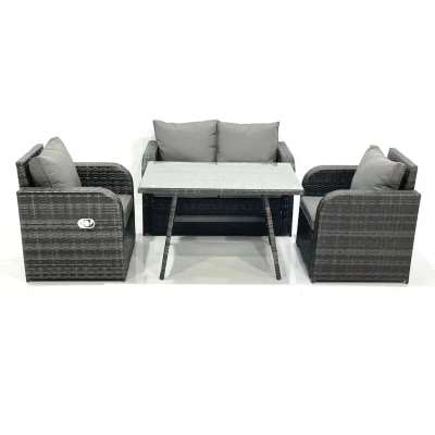 General description This classic outdoor garden furniture set is designed to accommodate up to 4 people, featuring a comfortable and soft cushion back. Made from premium dark grey rattan, it is built to withstand British weather conditions. The set includes two reclining chairs, a love sofa, and a rectangular dining table, all crafted for durability and style. Technical specifications 2 x Reclining Chair: 74W x 67D x 79H cm 1 x Love Sofa: 124W x 67D x 79H cm 1 x Rectangular Dining Table: 110L x 70W x 70H cm Seat Cushion Thickness: 8 cm Material: Dark grey mixed rattan with dark grey fabric Frame: Sturdy galvanized steel tube with powder coating Glass: 5mm thickness transparent tempered glass Installation Items come flat packed and are easy to assemble. Please ensure to check the product carefully before signing for delivery. If there is any obvious damage upon arrival, kindly mark it on the receipt for claims. Usage The armchairs are adjustable, allowing you to change the inclination