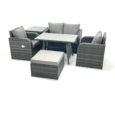 General description This classic outdoor garden furniture set is designed to accommodate up to 5 people, featuring a comfortable and soft cushion back. Made from premium dark grey rattan, it is built to withstand British weather conditions. Technical specifications Set Dimensions: Side coffee table: 65L x 65W x 66H cm Big footstool: 65L x 65W x 34H cm Reclining Chair: 74W x 67D x 79H cm Love Sofa: 124W x 67D x 79H cm Rectangular Dining Table: 110L x 70W x 70H cm Seat Cushion Thickness: 8 cm Compatibility and accessories Removable cushion cover for easy cleaning Rain cover recommended when not in use Installation Items come flat packed and are easy to assemble Sturdy galvanized steel tube metal frames with powder coating to prevent rust Usage Adjustable reclining chairs with an inclination range of 90°-130° Keep cushions indoors or covered when not in use Use a rain cover for long-term protection Other information 5mm thickness transparent tempered glass with suckers on the surface to