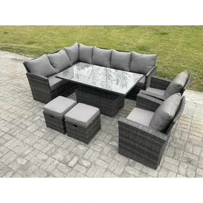 General description This deluxe rattan rising sofa dining set is an excellent addition to your patio or garden. It is made of high-quality PE rattan and features a durable galvanized steel construction, ensuring sturdiness and longevity. This set can be left outdoors all year round, making it a practical choice for outdoor living. Technical specifications 2 x Chair Size: 74W x 69D x 79H cm 2 x Small footstools dimension: 40L x 40W x 34H cm (Fully Assembled) 1 x 3 Seater sofa with double armrest: 162L x 67W x 79H cm (Fully Assembled) 1 x 3 Seater sofa with single armrest: 157L x 67W x 79H cm (Semi-Assembled) 1 x Rising dining table: 140L x 80W x 68/48H cm (height adjustable from 68 cm to 48 cm) Material: Dark grey mixed rattan with dark grey fabric 8 cm thick seat cushion with soft pillow back cushion for added comfort 5 mm thickness clear tempered glass with suckers on the surface to prevent sliding Installation Items come flat packed; self-assembly is necessary. Sturdy galvanized