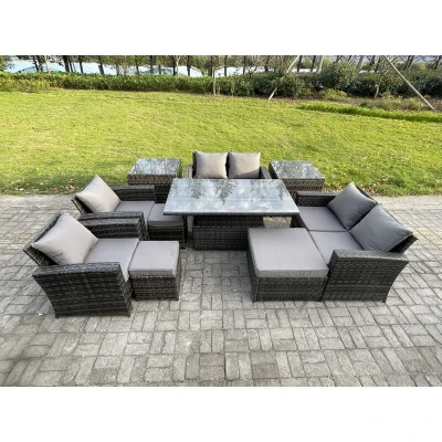 Outdoor Garden Furniture Sets 10 Pieces Wicker Rattan Sofa Dining Table Set with 3 Footstools 2 Side Tables Dark Grey Mixed Fimous
