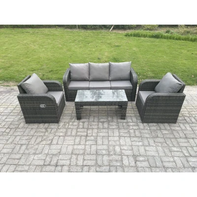 General description This classic outdoor rattan sofa set is a great addition to your patio or garden. Made of high-quality PE rattan and durable galvanized steel construction, it offers sturdiness and long-lasting durability, allowing it to be placed outdoors all year round. This set is perfect for gathering with family and friends. Technical specifications 2 x Reclining Chairs: 74L x 67W x 79H cm 1 x 3-Seater Sofa: 177W x 67D x 79H cm 1 x Oblong Coffee Table: 105L x 50W x 48H cm Color: Dark grey mixed rattan with dark grey fabric Seat Cushion Thickness: 8 cm Installation Items come flat packed and are easy to assemble. Sturdy galvanized steel tube metal frames with powder coating to prevent rust. Usage The armchairs are adjustable, allowing you to change the inclination of the chair back from 90° to 130° using a button. Keep the cushions indoors or use a rain cover when not in use. For long-term storage, cover the furniture with a rain cover. Other information 5mm thickness