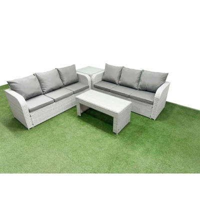 General description This 6-seater deluxe garden furniture set enhances the aesthetic of your courtyard, deck, backyard, porch, or swimming pool. Constructed from high-quality PE rattan and durable galvanized steel, it is designed to withstand adverse weather conditions in the UK. The set can be easily reconfigured to suit your needs. Technical specifications 2 x 3-seater Sofa Size: 177W x 67D x 79H cm 1 x Side Table: 65L x 65W x 66H cm 1 x Rectangular Coffee Table: 105L x 50W x 48H cm Material: Light grey PE rattan with dark grey fabric Cushion Thickness: 8 cm Glass Thickness: 5 mm tempered glass Installation Items come flat packed for easy assembly. Sturdy galvanized steel tube metal frames with powder coating to prevent rust. Usage Low maintenance required. Removable cushion covers for easy cleaning. Keep cushions indoors or use a rain cover when not in use. Use a rain cover if the furniture is not in use for an extended period. Other information Factory direct sale guarantees