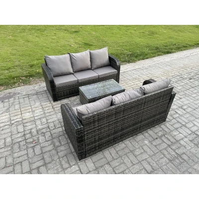 General description This 6-seater deluxe garden furniture set enhances the beauty of your courtyard, deck, backyard, porch, or swimming pool. Constructed from high-quality PE rattan and durable galvanized steel, it is designed to withstand adverse weather conditions in the UK. The set can be easily reconfigured to suit your needs at any time. Technical specifications 2 x 3-seater Sofa Size: 177W x 67D x 79H cm 1 x Oblong Coffee Table Size: 85L x 50W x 37H cm Material: Dark grey mixed rattan with dark grey fabric Seat Cushion Thickness: 8 cm Glass Thickness: 5 mm tempered glass Installation Items come flat packed and are easy to assemble. Includes sturdy galvanized steel tube metal frames with powder coating to prevent rust. Usage Low maintenance with removable cushion covers. Keep cushions indoors or use a rain cover when not in use. Use a rain cover for the furniture if not in use for an extended period. Other information Factory direct sale guarantees quality and after-sale service.